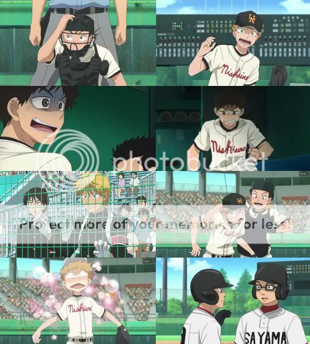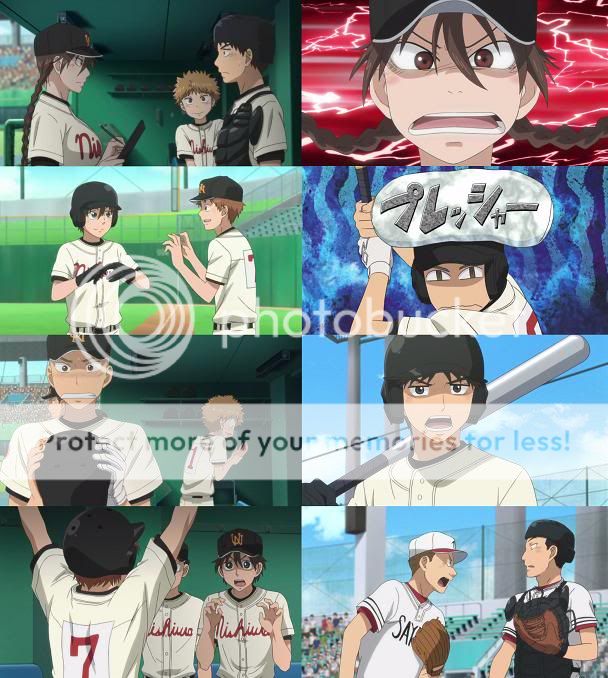 田島與三橋首次搭檔,雖然モモカン說了配球交給她負責,不過考量著比賽狀況田島在配球中還是加入了自己的意見,摸索著裁判的好球帶卻讓三橋投出了4壞球保送,這讓阿部下定決心一定要早點把傷養好趕快回到補手的位置XDD